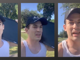 Un homme blanc court pendant des kilomètres avec une télévision avec...